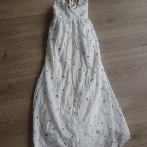 Lekker kjole fra H&M. Kjolen i nydelig blåfarge med sort blomstertrykk har A-fasong og passer str 42-46. Rynker i halslinning, kjolen lukkes bak med to knapper, lengde ca. til ankel. Bred mansjett med to knapper. Kjolen er foret med nydelig blått stoff.