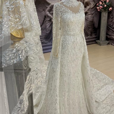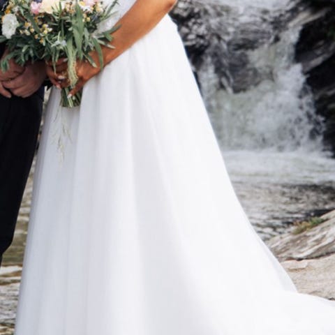 Kjøpte den gjennom «stillwhite» fra «Unique Bridal» brudebutikk i Canada. Så den er aldri blitt brukt ute eller i bryllupp, og lappen henger fortsatt på.