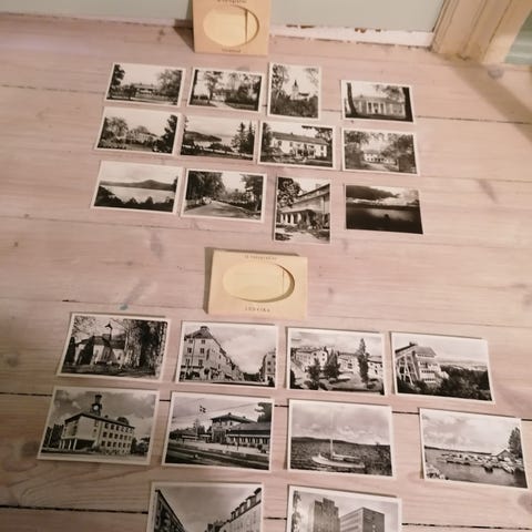 Har 9 forskjellige pakker med gamle suvenir-bilder fra Romsdalen, Gudbrandsdalen, Sunnmøre, Geiranger, Sognefjellvegen, Vest-Norge, Jotunheimen og Östersund.