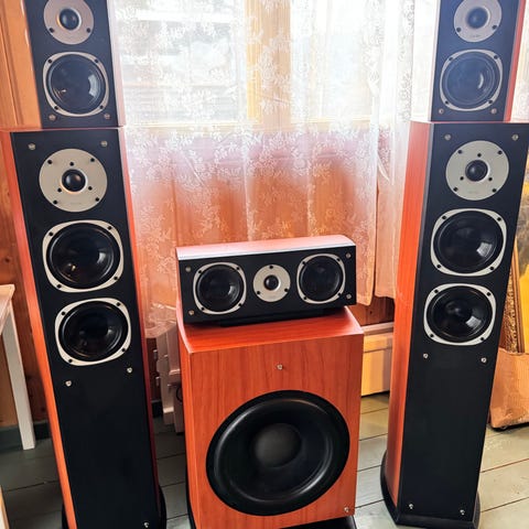 Selger et komplett og meget lekkert høyttalersett fra Scansonic S-serien i eksklusiv rød pianolakk. Dette er et fullt surround-oppsett som gir både kraftig lyd og flott design – perfekt til hjemmekino eller hi-fi.