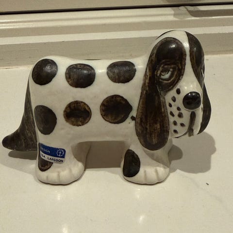 Samler du på de nydelige figurene til Lisa Larsson? Jeg selger en nydelig sel laget av Lisa Larson i serien «utrydningstruede dyr» i 1977 for NK og WWF på Gustavsberg porselensfabrikk. Den er laget i kun 2000 eksemplarer. Dette er et samlerobjekt! Bilder lånt fra internett fra Ebay der den er priset til over 6000 kr! Selen er 18 cm lang. Den eneste feilen jeg kan se er at merkelappen under er litt avskrapet. Jeg har dessverre ikke original eske eller sertifikat, så den selges for kr 1600.