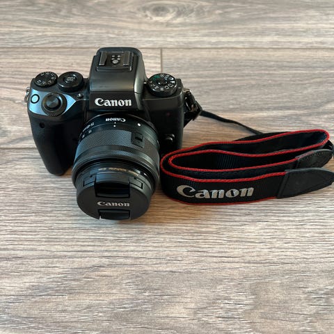 Canon EOS M5 med 15-45mm original linse. 2 stk batterier, kabel, lader og 8GB minnekort medfølger.