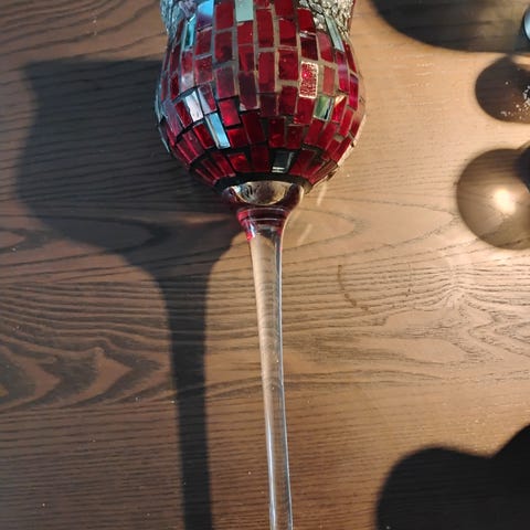 Selger en flott lysestake i mosaikk design, med rødt glass.