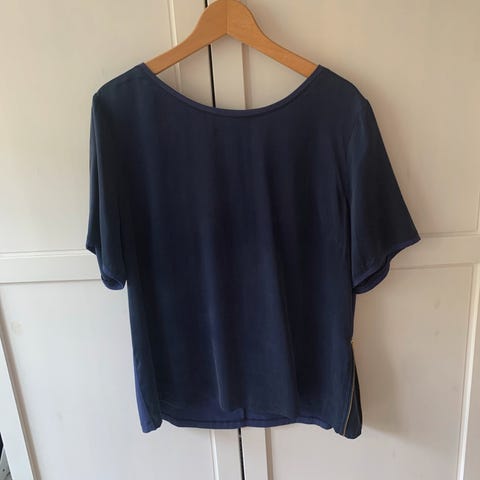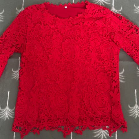 Langermet bluse i nydelig blank vinrød / burgunder 100% silke med stretch (Image in). Snor nederst i livet som knytes så løst eller stramt du ønsker. Passer til str S-L. Brukt en gang og vasket.