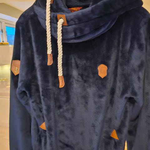 Ikke brukt, bare prøvd. Hettegenser veldig pent i mørk blå farge. Den er romslig og har gode plassform.