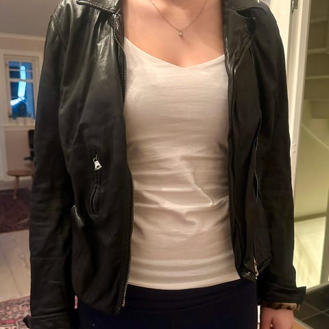 Cropped fit, med lange ermer som kan brettes opp. Merket str. 46, men tilsvarer nok nærmere str. 40. Jeg er 170cm, normalt str. 36, og denne når meg til hoften. Den er noe bred til meg, men syns den allikevel sitter pent på da den er av mykt skinn. Vil tro den passer best på en str. M.
