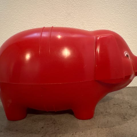 Selger ny sparegris / sparekasse. Det er noe euro mynter inne, tror rundt 50 cent.