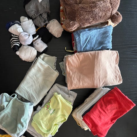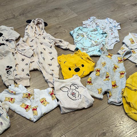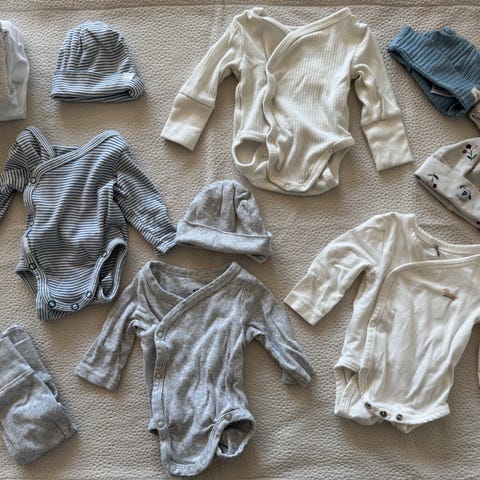 Pakken består av 10 bodyer, 5 bukser, en genser og 6 pysj/onesies. Følger nok ned noen luer/sokker også, når jeg er ferdig å rydde.
