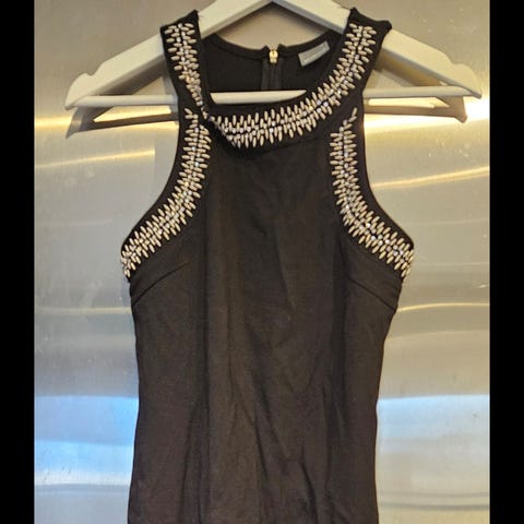 Lekker lang kjole i gull og sort. Str m, smal fasong men veldig strechy og behagelig. Kun brukt en gang. Fin drapering foran.