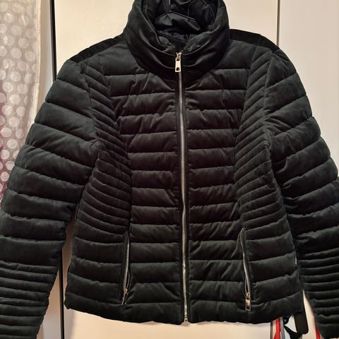 Vattert marineblå jakke/boblejakke med nydelige detaljer i gull-utførelse.