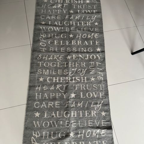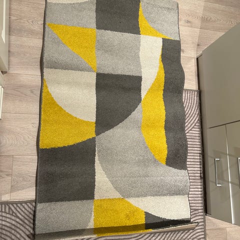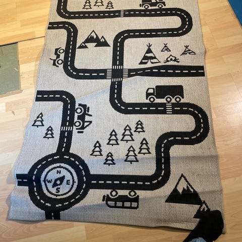 Koselig teppe til barnerom selges. Grått med grønne detaljer.