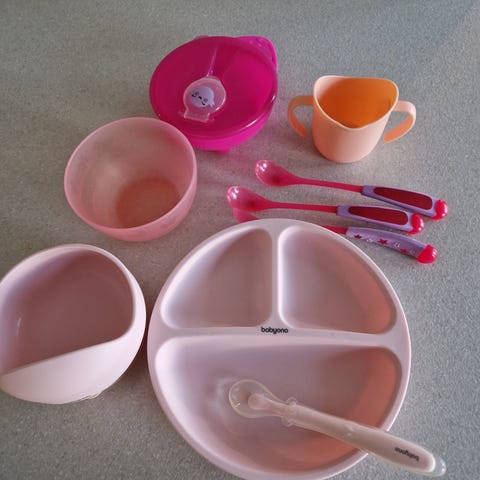 Praktisk tuttflaske med lokk og skål/boks med lokk fra Tommee tippee. Veldig fin å ha med på tur. Diverse bestikk fra blant annet ikea. Barnesikring til skuffer/skap + hjørner.