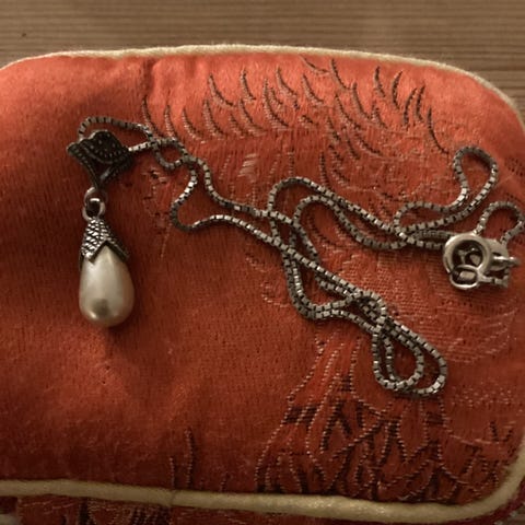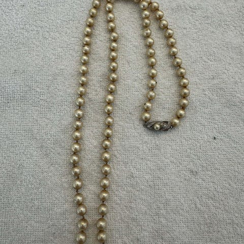 Forgylt sølvkjede med perler selges for 250 kr. Perlene er ikke ekte, men er uten skader og har en fin glans. Det er 43 cm langt. Stemplet 925.