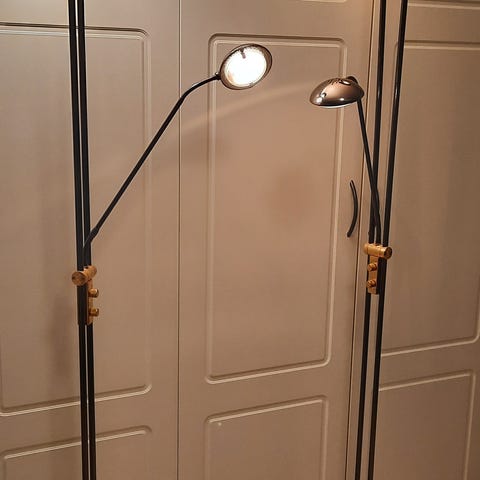 Stålampe, h. 180 cm, led lyslampe mot tak og leselampe. Godt brukt