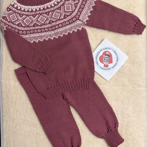4) genser, bukse, lue, sokker. Brun og lysebrun