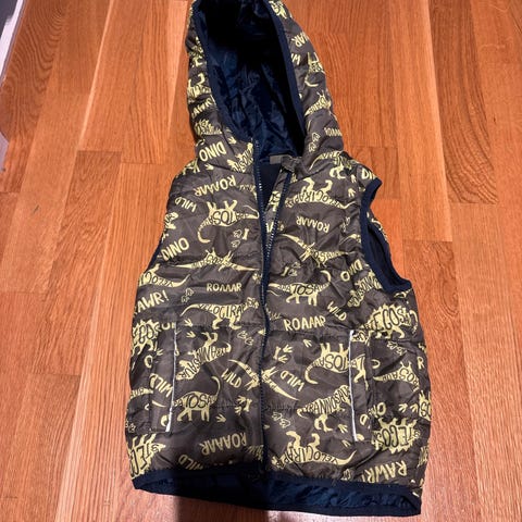 Knalltøff vest med hette i str 68. Aldri brukt, men lappen tatt av. Blåfargen på bildet av vesten bakfra er best beskrivende av fargen.