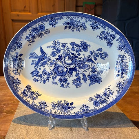 Antikt porselen er vakkert og meget anvendelig Kvaliteten er ofte veldig god og derfor kan man godt bruke det. Fatet er håndmalt med dekor i koboltblå, under glasur. Fatet er meget fin med rester av forgylling.