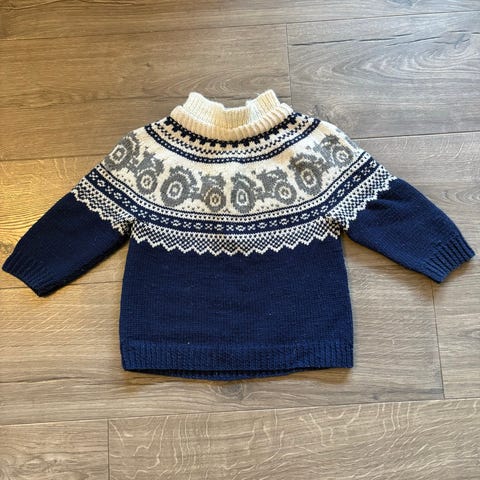 Selger en nydelig hjemmestrikket traktor genser.