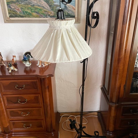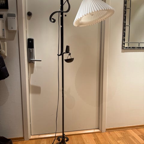 Eldre gulvlampe i smijern. Skjermen har en bulk.