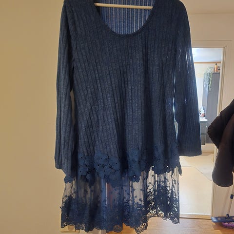 Nydelig strikke kjole fra Derhy . Gulltråder i stoffet som gir den en ekstra glans. Innsvinget i livet og folder i skjørtet. Kjolen er ny, ubrukt men tags er tatt av. Nypris 1500,-