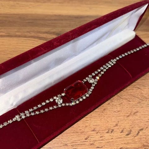 Armbånd i rød farge med flere røde diamanter/stener. Kan justeres til ønsket størrelse.