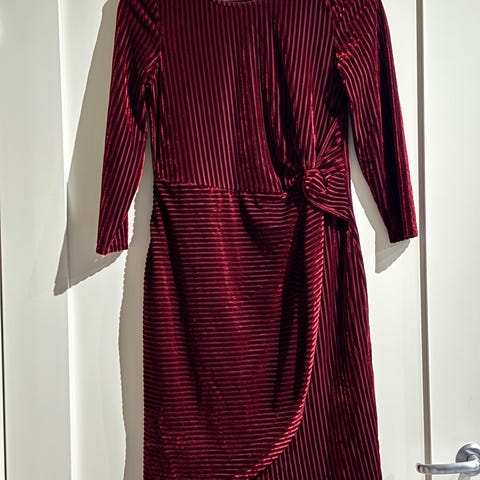 Klassisk, knelang kjole, "den lille sorte". Perfekt til julebord og fester. Knyting i livet og splitt bak fremhever figuren. Veldig fin på! Brukt 1 gang. Selges da den dessverre har blitt i trangeste laget...