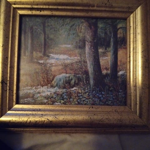 Naturlandskap i ranme. Signaturen øy årstall på bildet synes å være A. B. G. .en usikker. Det ant6desvatcbildet er malt i 1 1881 men kan og være 1931. Ma sees.