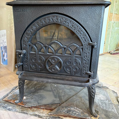 Brukt vedovn med aske skuff. Høyde 75 cm. Bredde 45 cm. Dybde 34 cm. Røykerør ca 12 cm. Kan brukes med røykerør oppå ovn også. Må hentes på Hansnes.