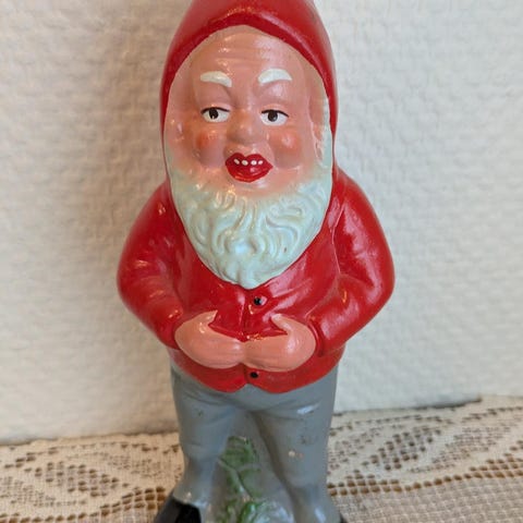 Fin gammel keramikk-nisse fra 1800-tallets slutt. Håndmalt med blå øyne, blondt skjegg, rød nisselue og bukser - hvit overdel. Sittende på en høy, brun stubbe. Aksler en grønn-malt krukke, som passer til kronelys. Det er ingen glassur over malingen, så den er litt avslitt her og der, men meget sjarmerende. - 21 cm høy og veier 848 gram. 12 cm på det bredeste.