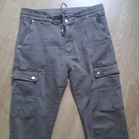 Sennepsgul, med strikk og knyting og strikk nederst på beina og litt stretch i buksa..