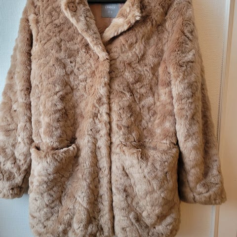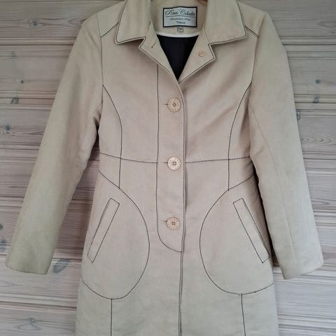Varm og lekker Kåpe/lang jakke fra Summum str 38. Farge beigebrun melert. Teddy med glatt for.