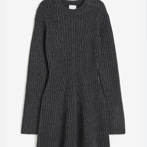 Kort, figursydd kjole i stretchjersey med liten ståkrage og skjult glidelås bak. Drapert foran og rynket søm bak på skjørtet. Lange ermer med rynkede sømmer ved skuldrene for ekstra volum. Jerseyfôr.