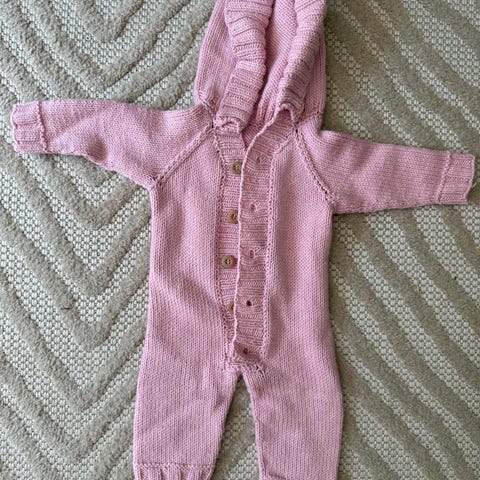 Selger 2 hjemmestrikkede dresser i mykt babyull. Dressene er strikket etter oppskrift på 0-3 måneder.