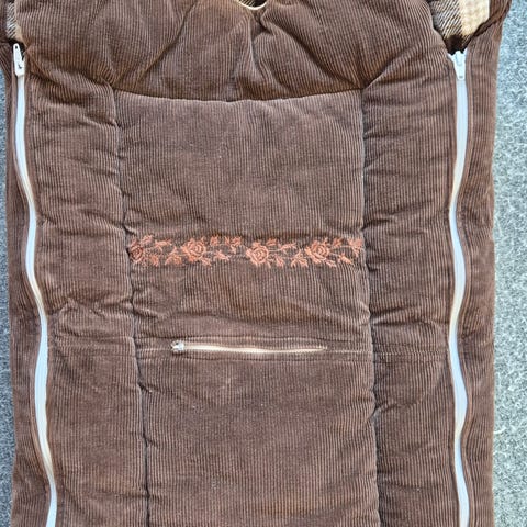 Retro vognpose med lammeskinn og marineblå flott fløyel.Gulig farge på saueskinnet og lukt.