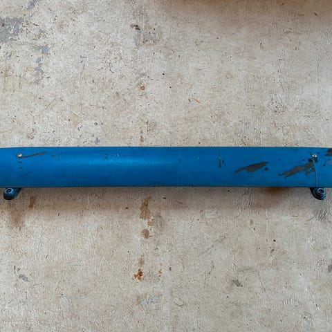 Den har en skade på venstre hjørne som må bankes/rettes før lakkering. Har også noe klarlakk flass samt rust.