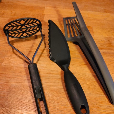 Selger øse, kjøkkenpinsett, pastaøse (ca. 30cm) og slikkepott samlet for 100 kr. eller bud.