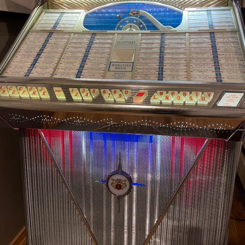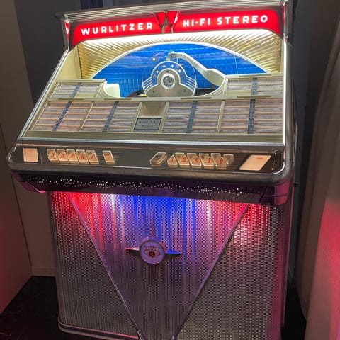 Hel og flott Jukebox som virker flott. Tar 100 singler. Har ca 60 singler ekstra som følger med. Alle fra 60, 70, 80 og 90 tallet. Følger også med eldre skrivemaskin med ekstra band og ekstra merkelapper ved bytte av plater. Flott lyd. Er laget mellom 1978 0g 1982 Ca. Kan sende film snutt når den er i bruk. Bare å ringe 95190742