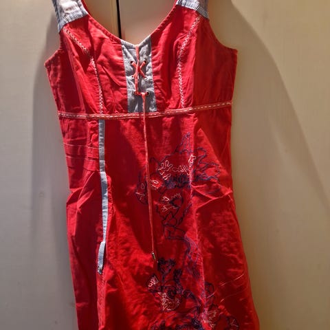 Kjolen er lårkort, lommene er kun til pynt , den er også sydd hele veien, knappene er ikke ment å åpnes.