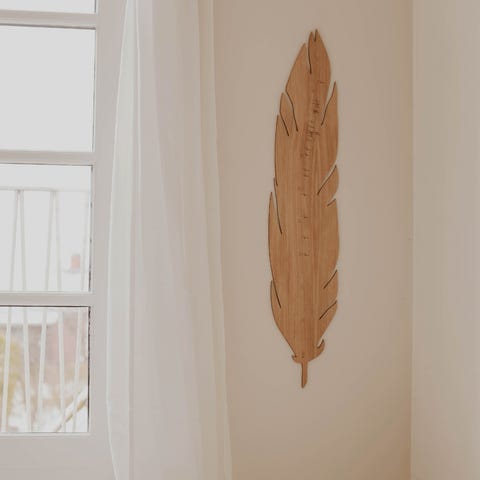 Fjæren er utskåret i eikefiner, og måler høyden til barnet fra 50 - 140 cm. Henges enkelt opp med dobbeltsidig teip og skruer (dette følger med)