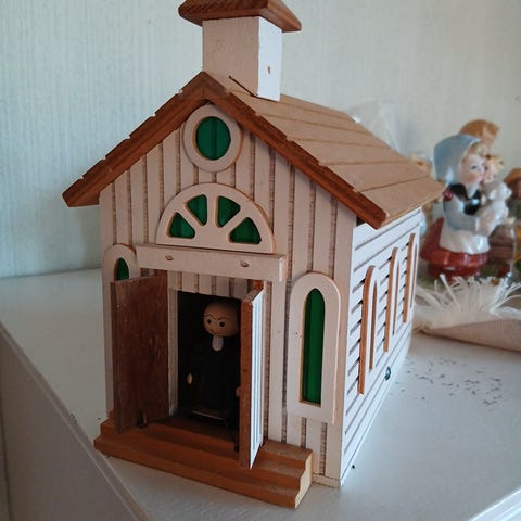 Gammel retro nostalgisk julekirke, med lys innvendig.