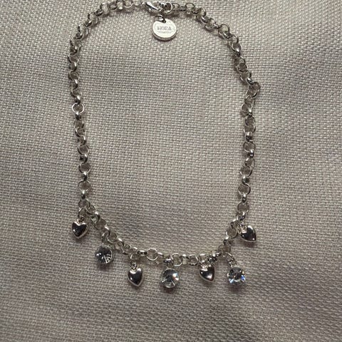Nydelig kjede med ferskvannsperler selges for 450 kr. Hver perle er festet til den neste med sølvtråd. Ikke noe stempel for sølv, men jeg tror ikke noen ville ha håndlaget et slikt kjede uten å bruke sølv. Jeg vet ikke hva de små blågrønne steinene nederst er, men fasettene er for skarpe til å være glass. Lengde 49 cm.