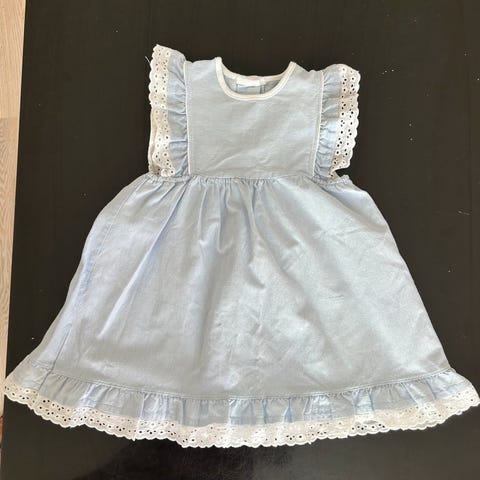 Kjole i ekte silke. Har noe misfarging fra en røde kanten ved vask, og et hull nederst i kanten som må sys. Veldig sval o skøn på varme sommerdager!