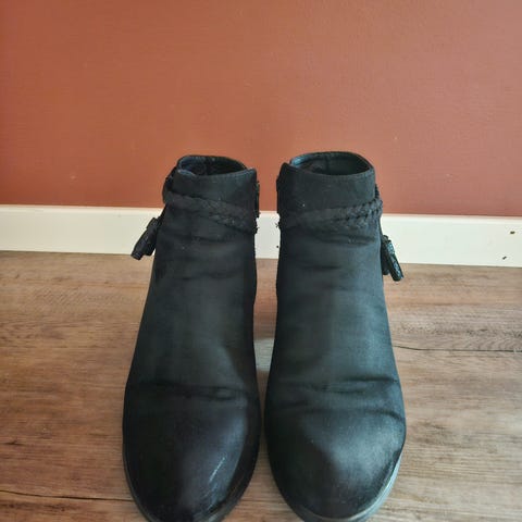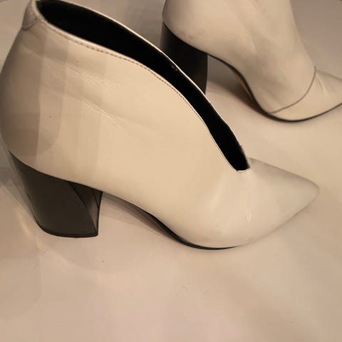 Les beskrivelse og se alle bilder! Hvite og sorte støvletter av Elizabeth & James. Størrelse 9B, som jeg mener er str 40 i EU (og som jeg får til å stemme når jeg prøver de på). sorte bruks/skrapemerker. Sorte under skoene. Skopose følger med.