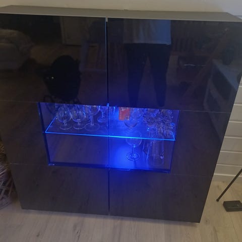 Flott skjenk med skap, hyller og to stk skuffer selges. Skjenken er i svart høyglans, og valnøtt innvendig. Den har 2 stk spotter. Utrolig fin!