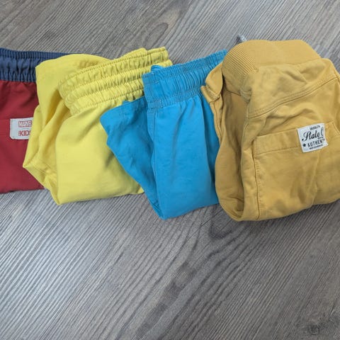 To jakker, to gensere, tights, badedrakt, t-skjorte, badekåpe