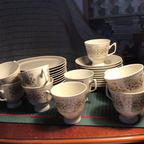 Vakkert vintage, hvitt porselen, med purpur og gull-mønstret kant fra Porsgrund Porselen - alle deler stemplet 1960-tallet. Alt meget pent og meget lite brukt. Det har aldri vært i oppvask maskin;