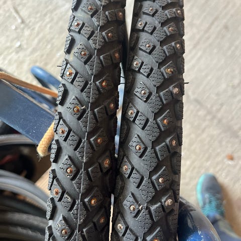 Selges 2 lite brukt vinterdekk Suomi Tyres med 240 pigger. Størrelse 28x15.