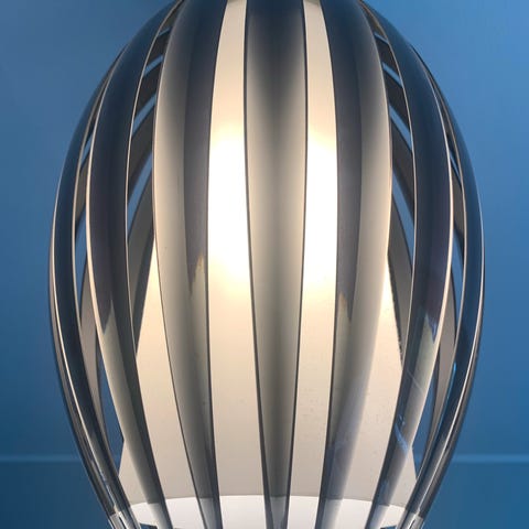Taklampe i plast. Kjøpt på Bohus for noen år siden. Skjermen kan brukes på begge sider. Enten som Gull eller svart. Se de siste bildene. Den ytterste skjermen er gull på den ene siden og svart på den andre. Innerskjermen et hvit( siste bilde) bildene av lampen viser med gullfarget skjerm