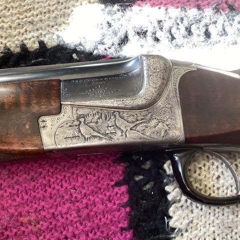 Meget pen Gebruder Merkel OU muligens en 201E med ejektor. Løpene er krombelagt inni og trangboringene er 1/4 og 3/4. Våpenet har hatt to eiere og nesten ikke brukt. Våpenet er produsert i februar 1987. Ingen tegn til rust.
