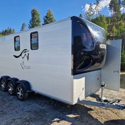 Lukket henger - brukt til frakte biler til løp - fremstår meget hel og pen - normale brukssmerker.